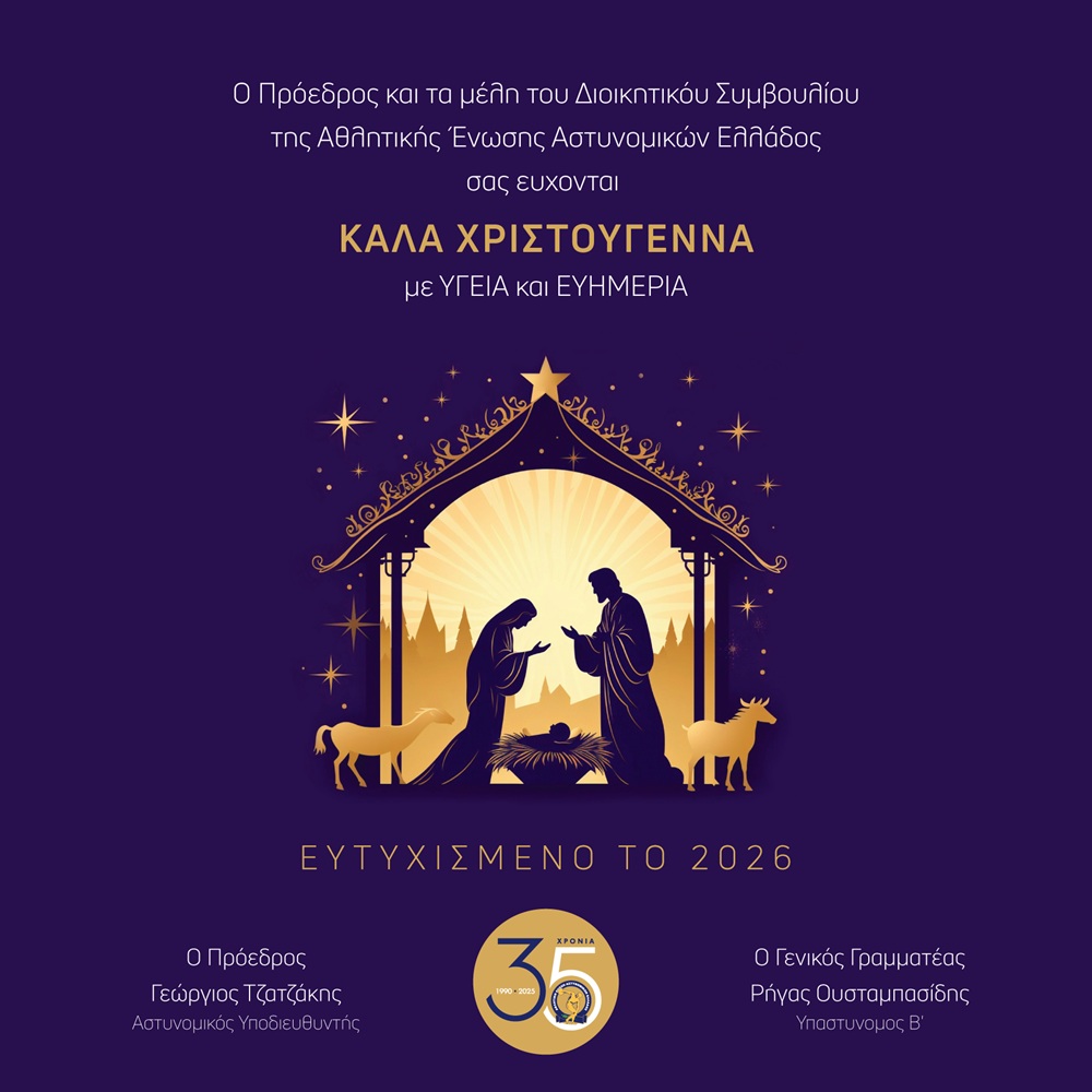 Ο Πρόεδρος και τα Μέλη του Διοικητικού Συμβουλίου της Αθλητικής Ένωσης Αστυνομικών Ελλάδος, σας εύχονται Καλά Χριστούγεννα με Υγεία και Ευημερία.