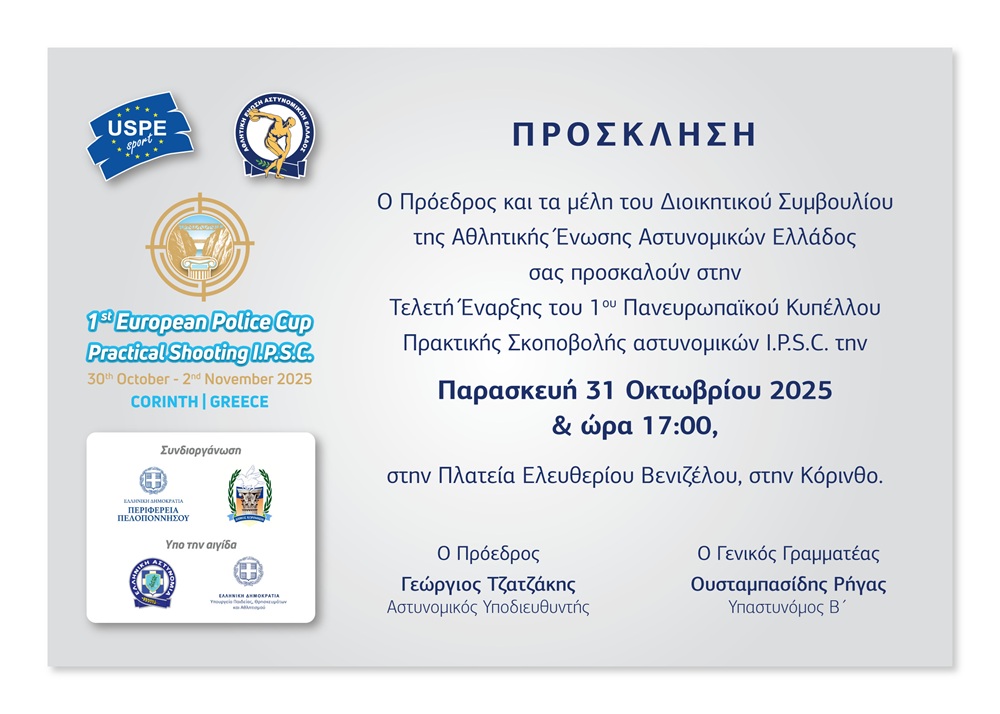 Ο Πρόεδρος και τα μέλη του Διοικητικού Συμβουλίου της Αθλητικής Ένωσης Αστυνομικών Ελλάδος σας προσκαλούν στην Τελετή Έναρξης του 1ου Πανευρωπαϊκού Κυπέλλου Πρακτικής Σκοποβολής αστυνομικών I.P.S.C. την Παρασκευή 31/10/2025 και ώρα 17:00, στην Πλατεία Ελευθερίου Βενιζέλου, στην Κόρινθο.